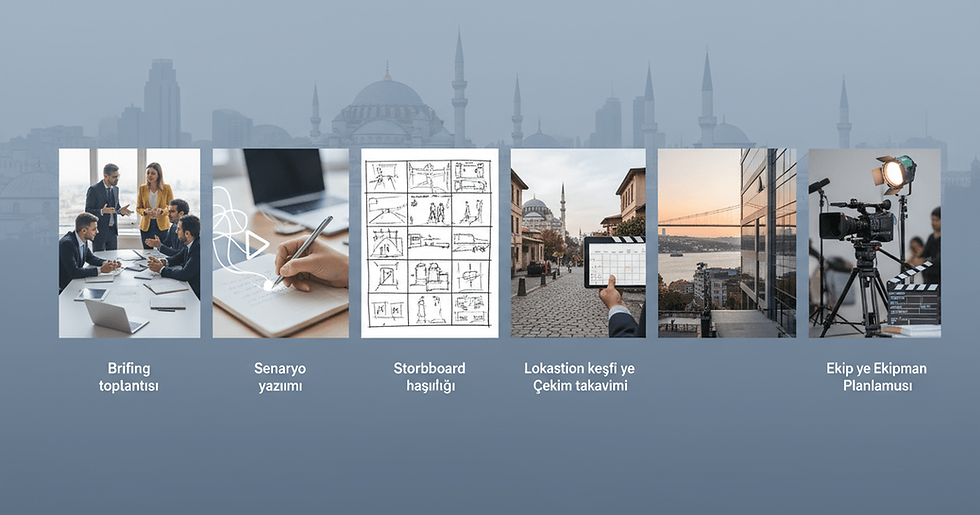Süreç yedi temel aşamadan oluşur: brifing (1-2 gün), senaryo (3-5 gün), storyboard (2-3 gün), çekim (1-2 gün), kurgu (5-7 gün), revizyon (3-5 gün), teslimat. Brifingde hedef kitle ve mesaj öncelikleri netleşir. Storyboard ile çekim gününde zaman kaybı minimuma iner.